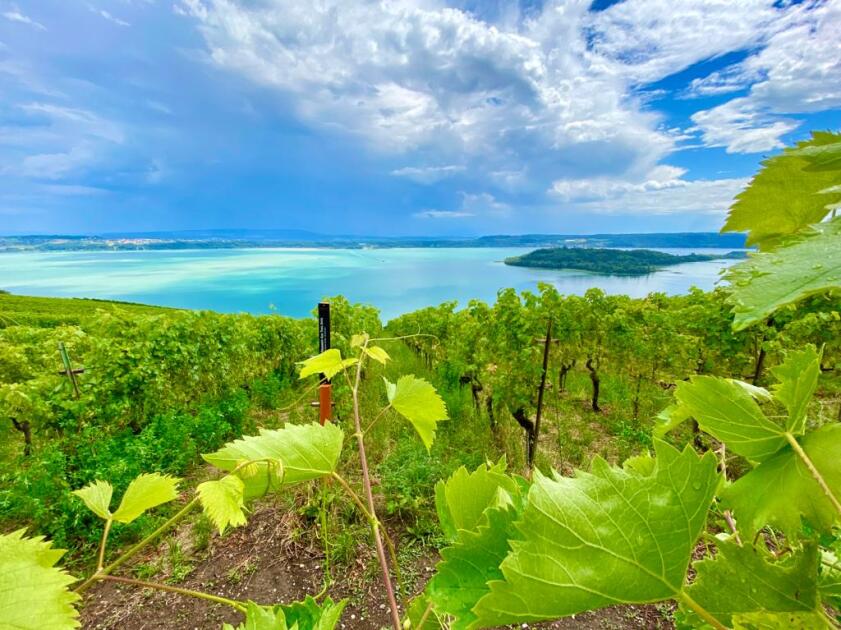 Die Sonne im Gesicht. Ein Glas Wein in der Hand. Der Blick wandert über die Reben hinab zum Bielersee und verliert sich am Horizont, wo sich die Alpen gegen den Himmel recken. Wahrlich ein Ort, wo sich Gedanken in Träume verlieren, wo man die Zeit gerne anhalten würde.
